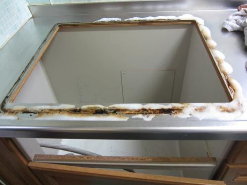ガスコンロを取り外して、キッチンにこびり付いた汚れをみがきます