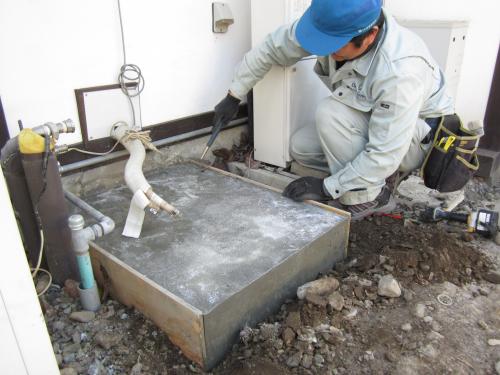 既設のガスボイラーを撤去してコンクリート架台の準備をします