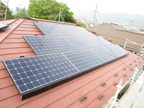 省エネ電化です!カラー鉄板の屋根に太陽光発電を取り付けて家計費削減です。瓦屋根に太陽光発電を設置します。【長野県長野市太陽光発電工事】 省エネ電化JP・エコ電化JP【大光電気商会】へご依頼下さい!