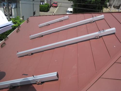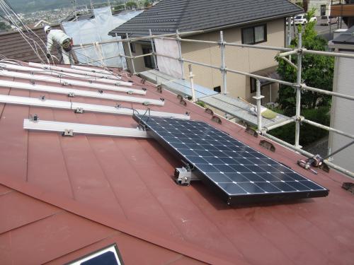 スタッフブログ 2013年3月3日省エネ電化です!カラー鉄板の屋根に太陽光発電を取り付けて家計費削減です。