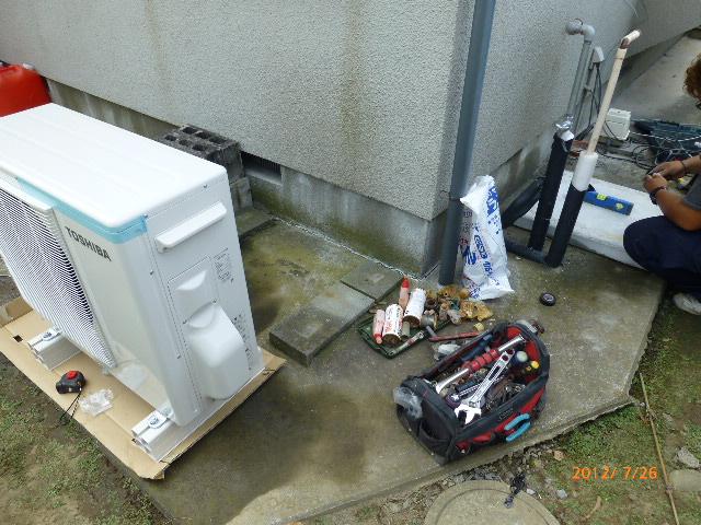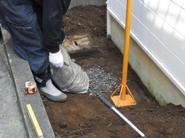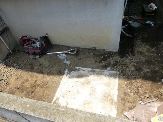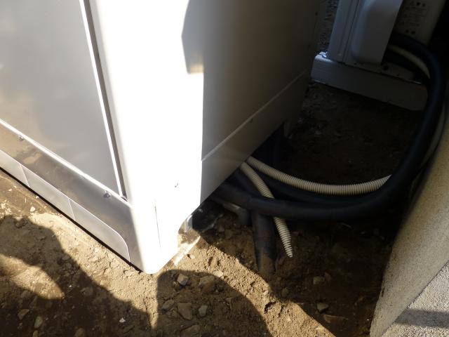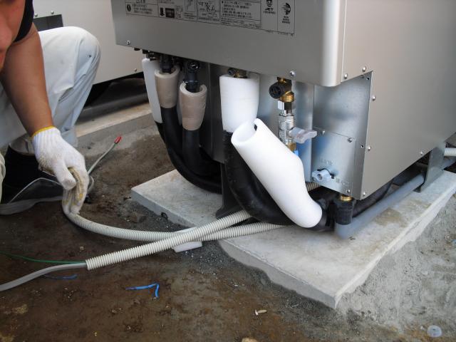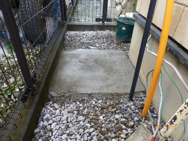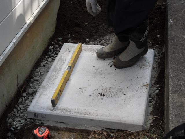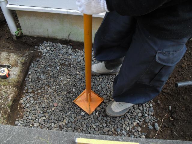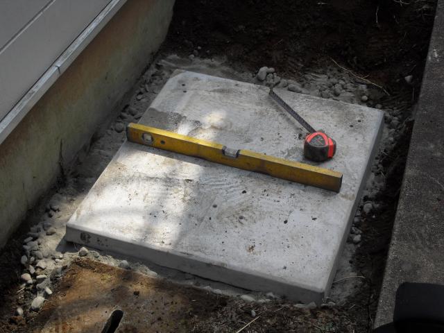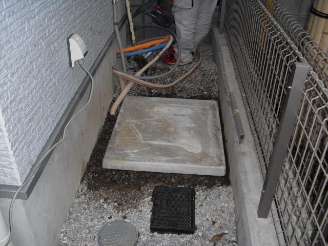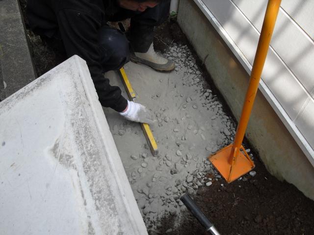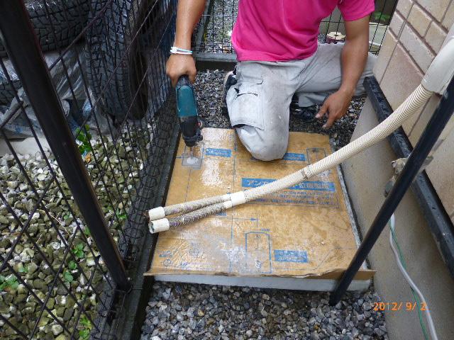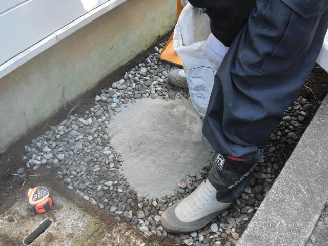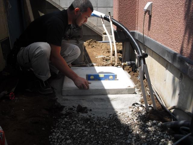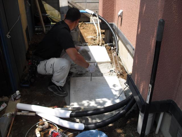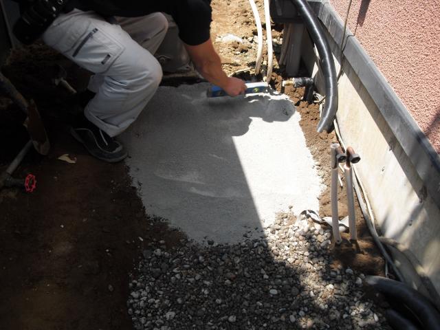 2012年9月10日 オール電化設置工事↑ ECOキュートの土台はまず砂利を敷きセメントを練り合わせ確りと土台を作り平板基礎を設置致します。