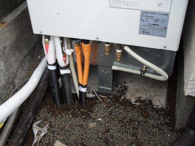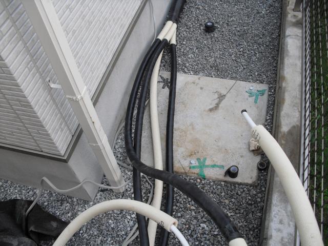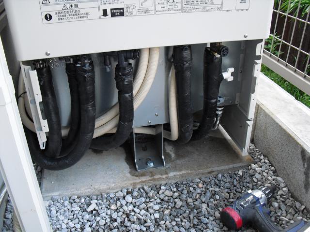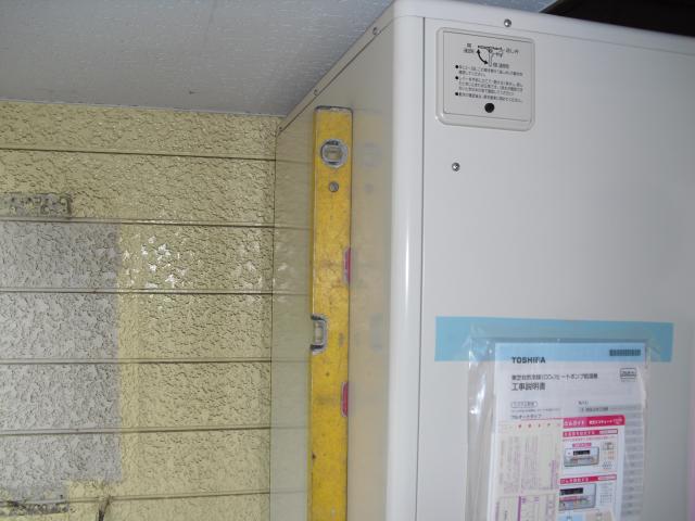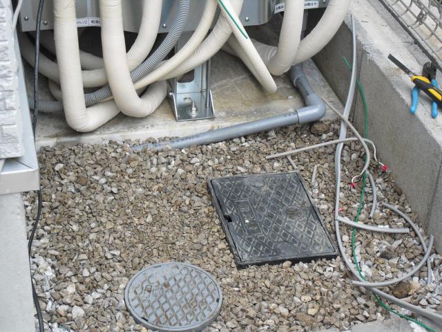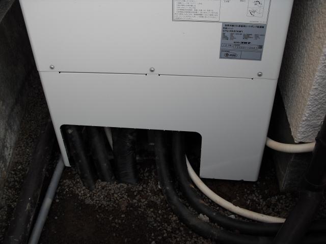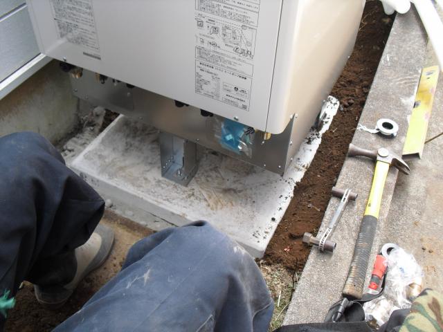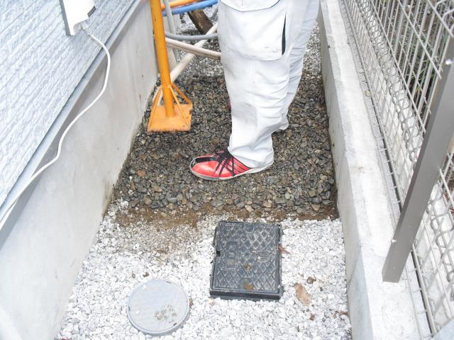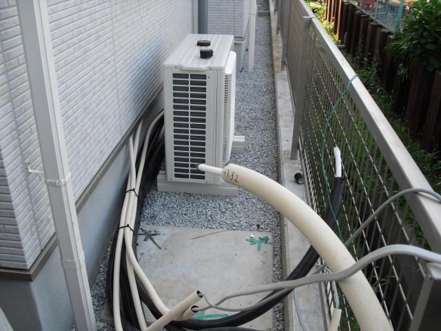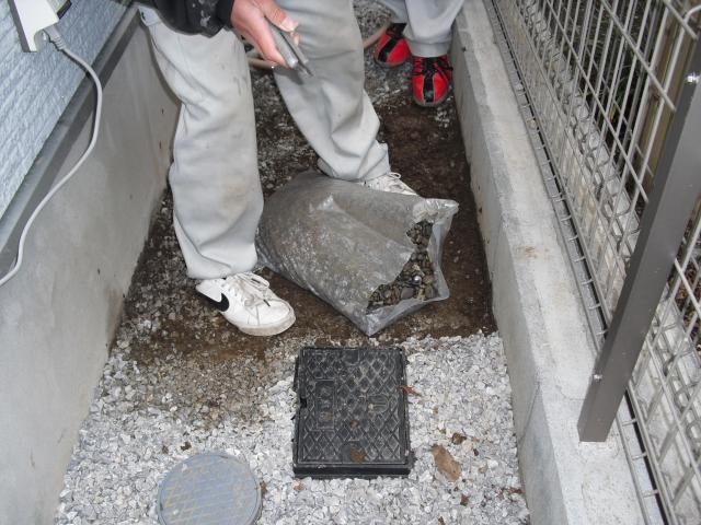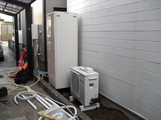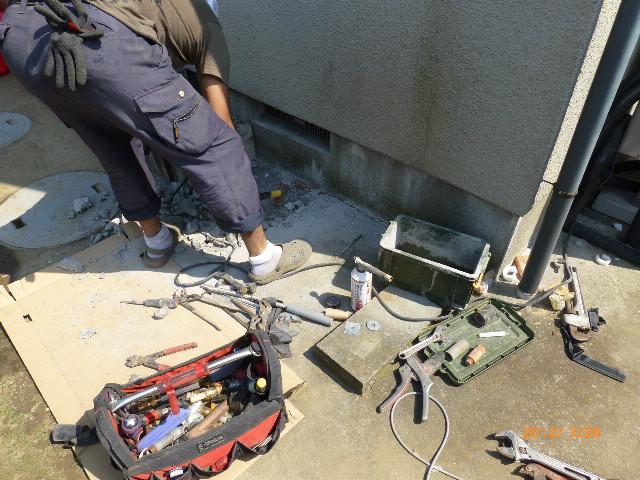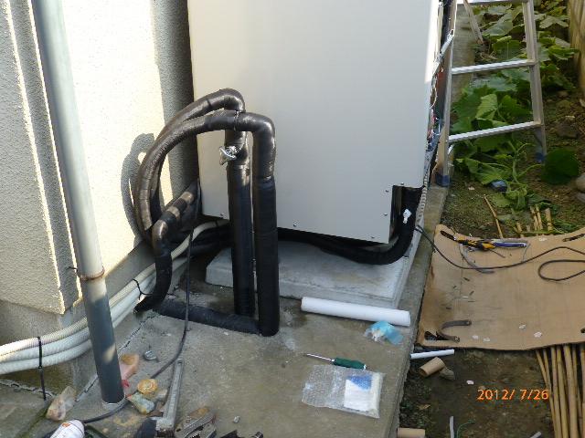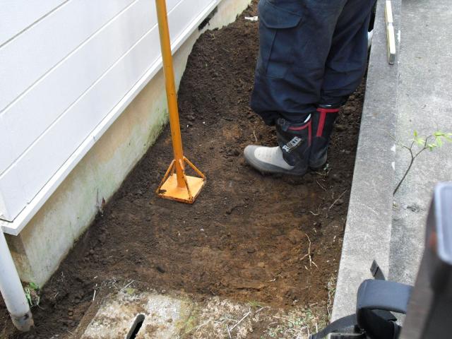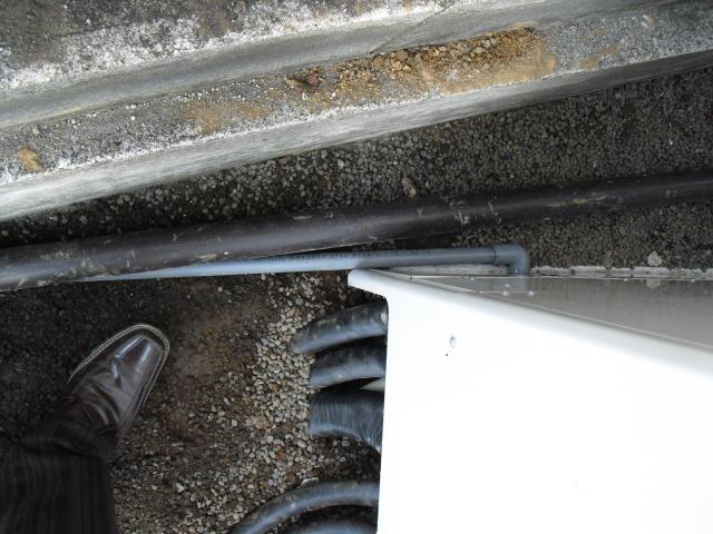 2012年9月10日 オール電化設置工事↑ ECOキュートの土台はまず砂利を敷きセメントを練り合わせ確りと土台を作り平板基礎を設置致します。
