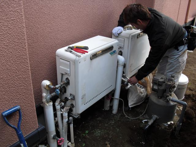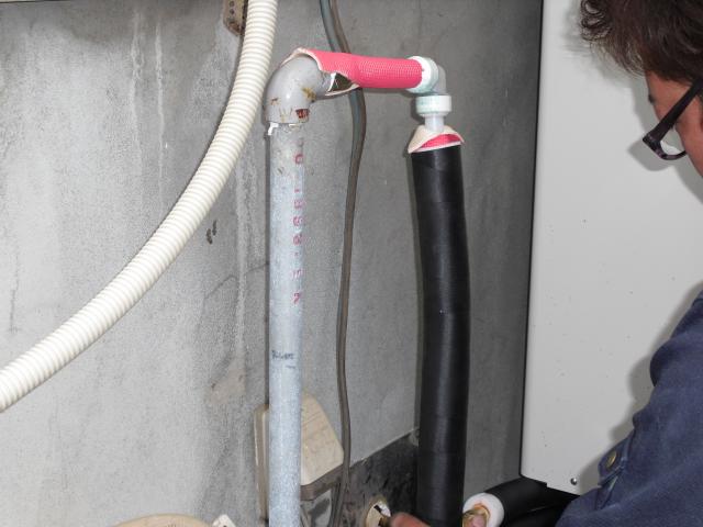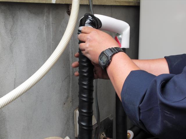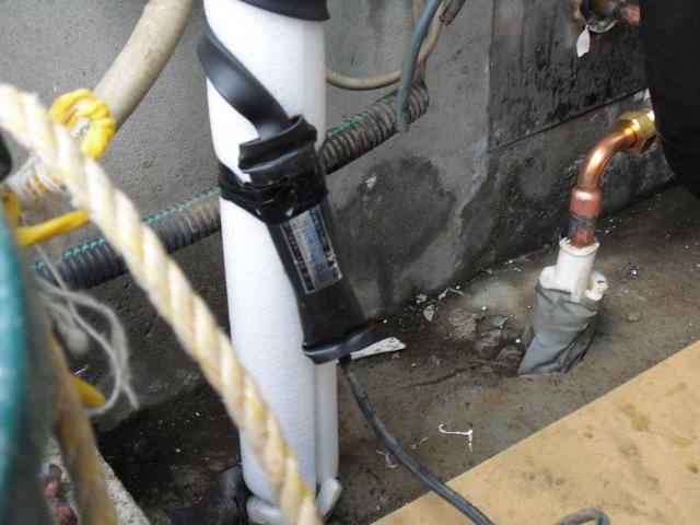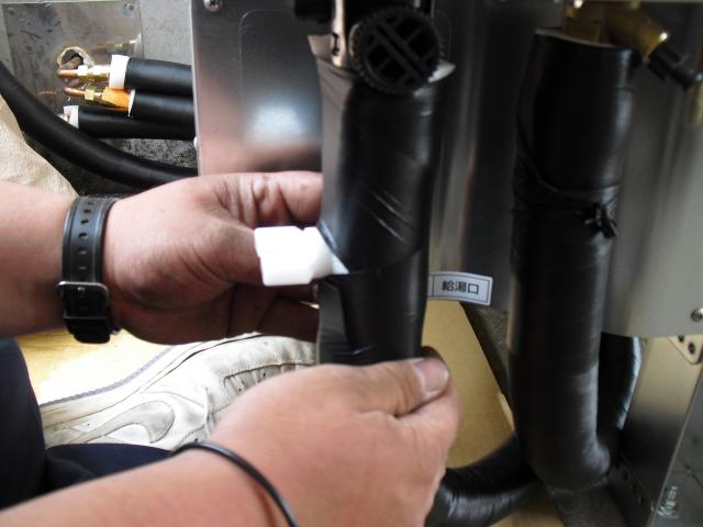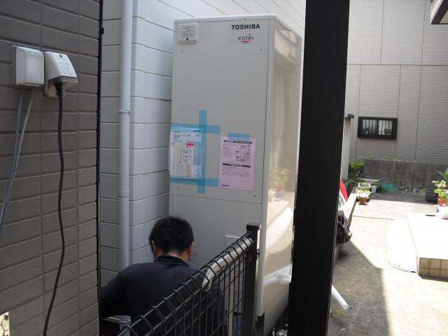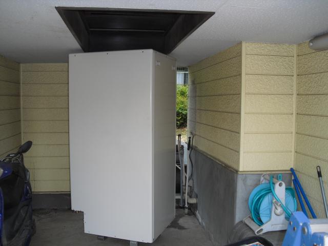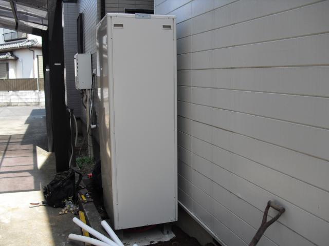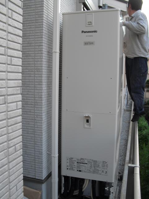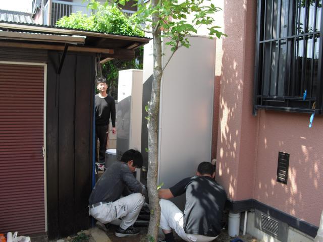 ↑ 狭い場所なので3人かかりでECOキュートを持ちあげます。