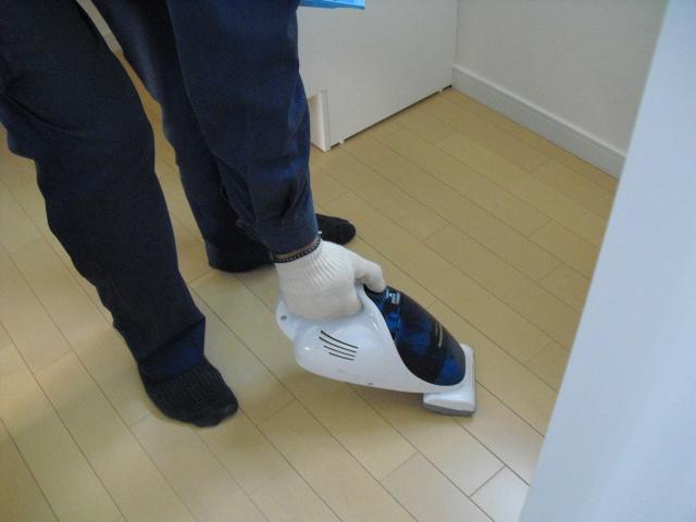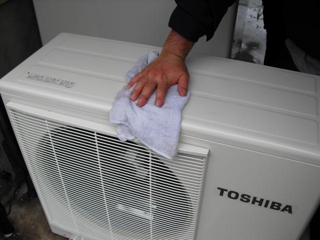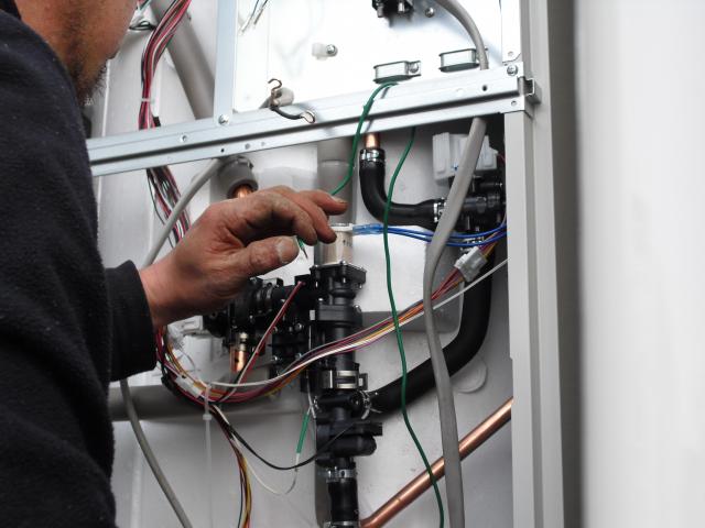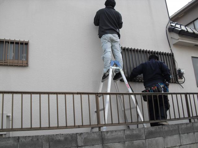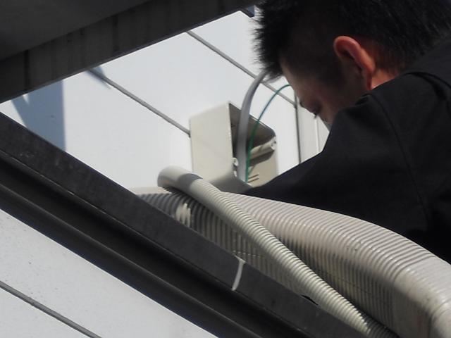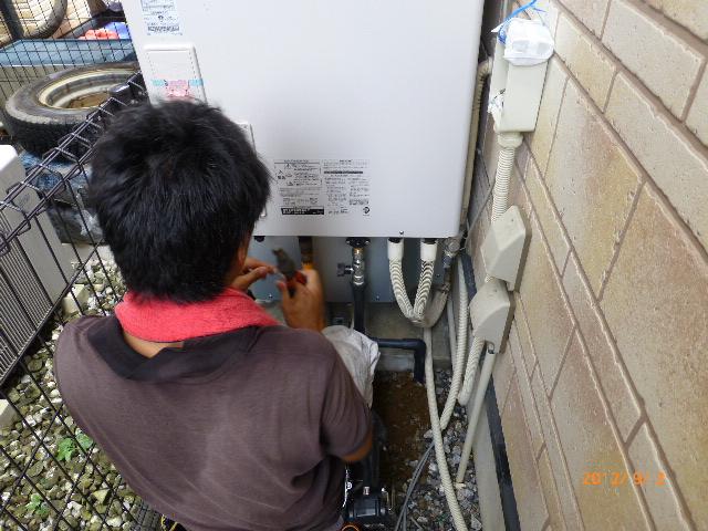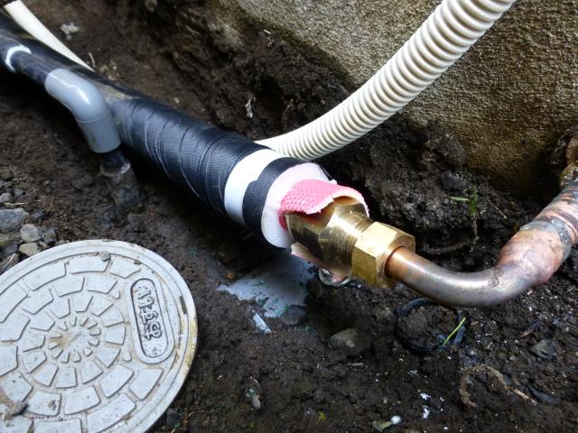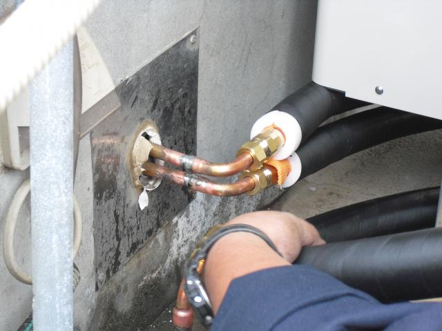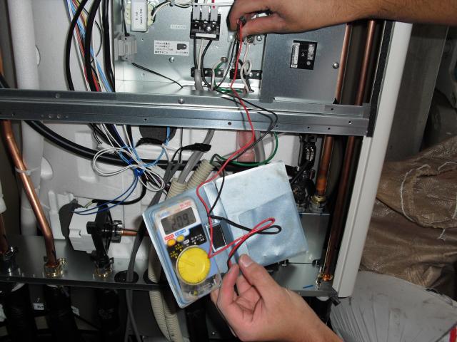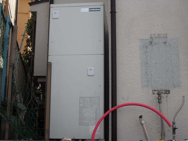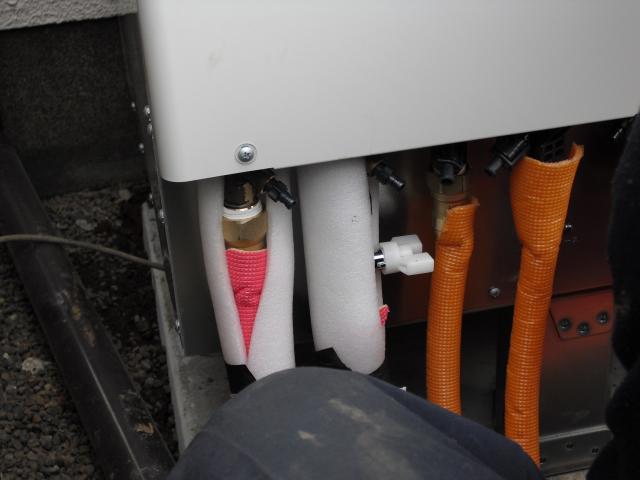↑ 狭い場所なので3人かかりでECOキュートを持ちあげます。