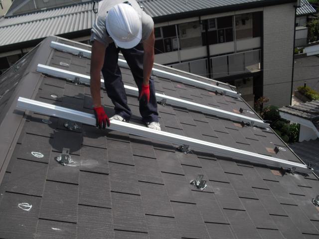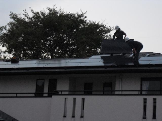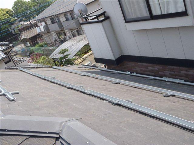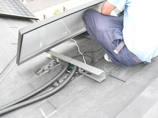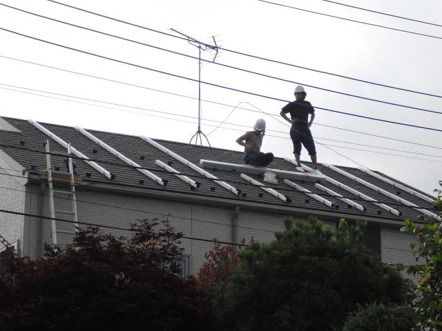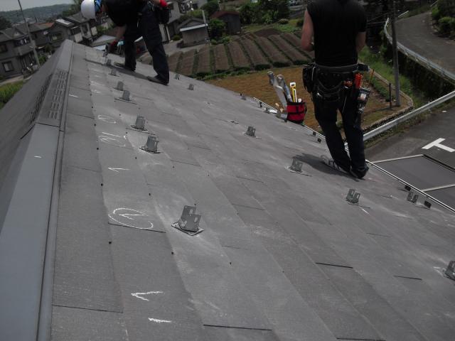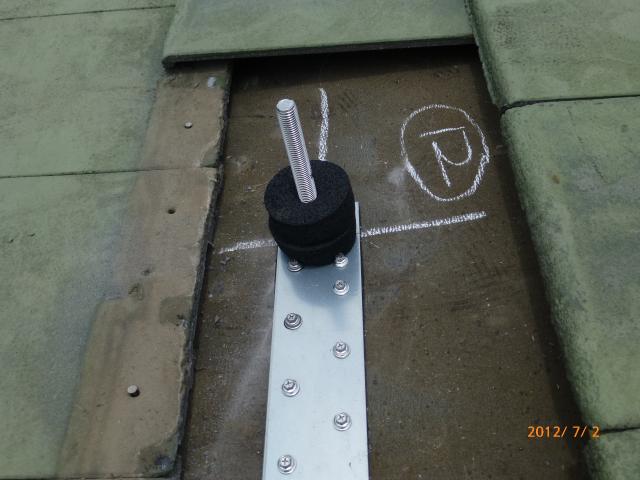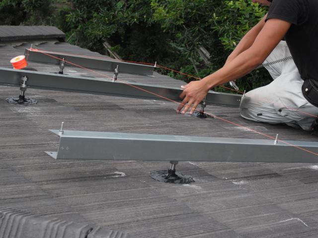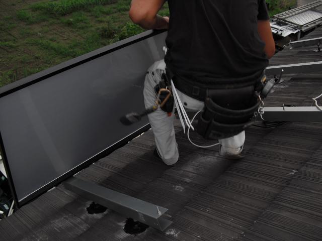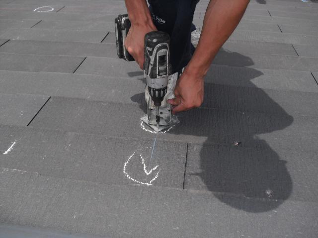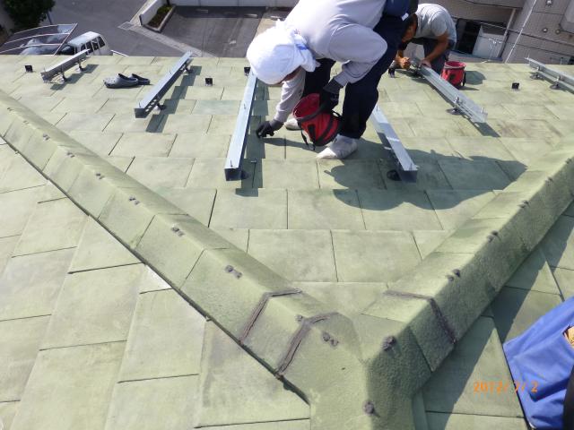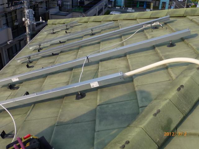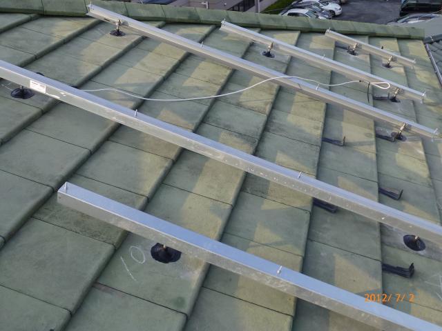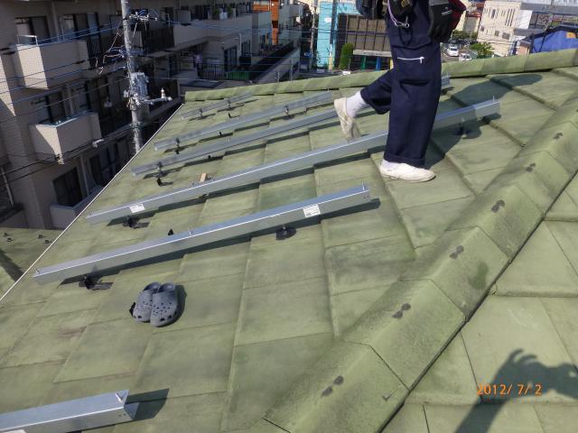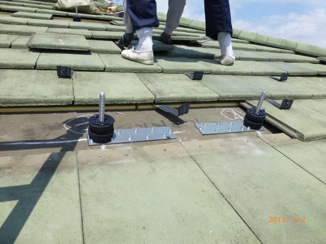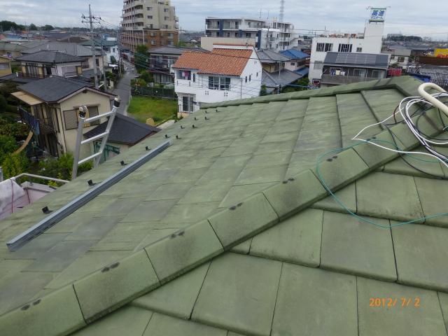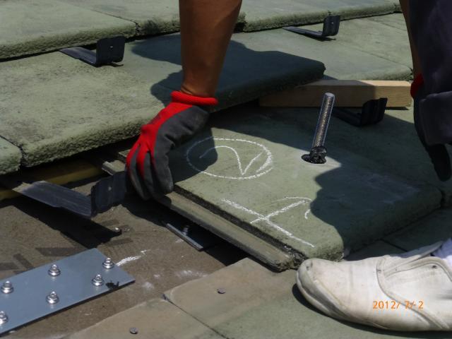 2012年7月3日 太陽光発電設置写真↑太陽光の架台を付ける為に、セメント瓦を一枚一枚剥がしアンカー金具を設置します。