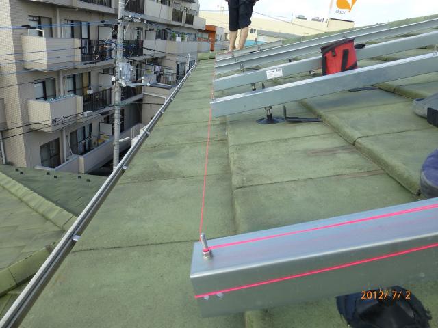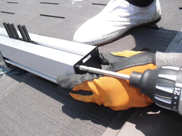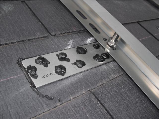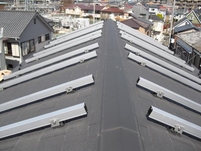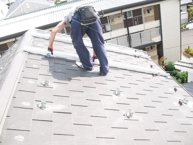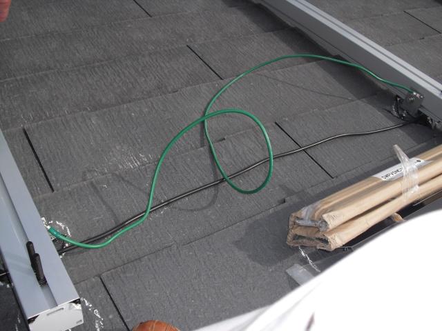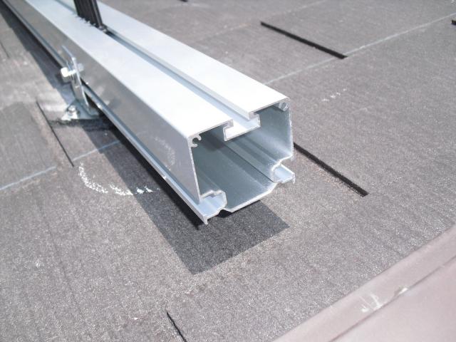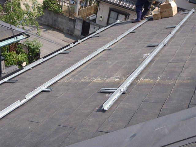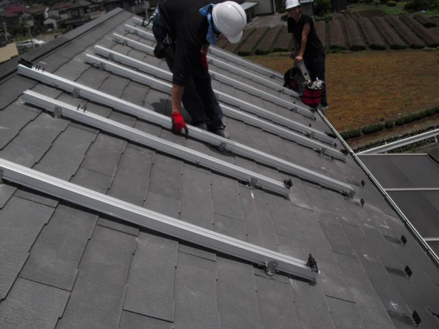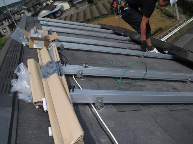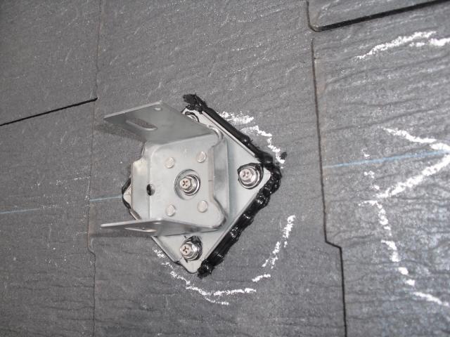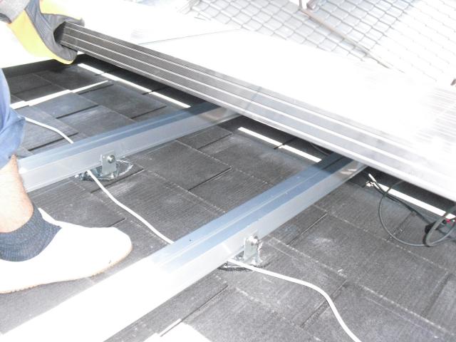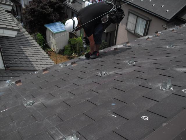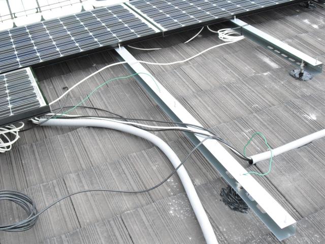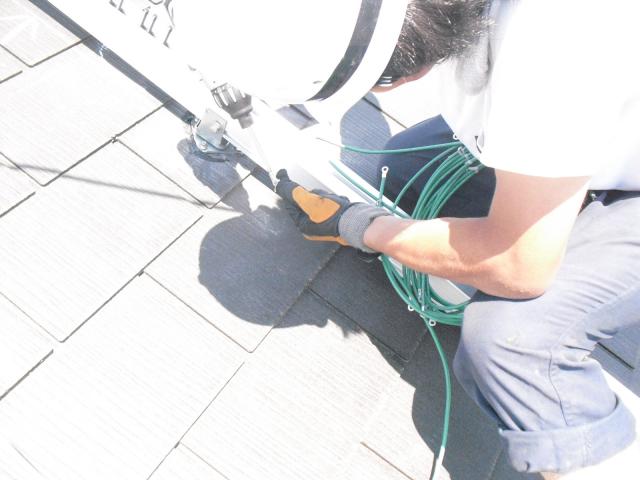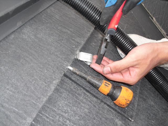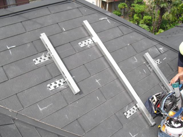 2012年7月3日 太陽光発電設置写真↑太陽光の架台を付ける為に、セメント瓦を一枚一枚剥がしアンカー金具を設置します。