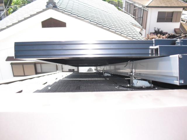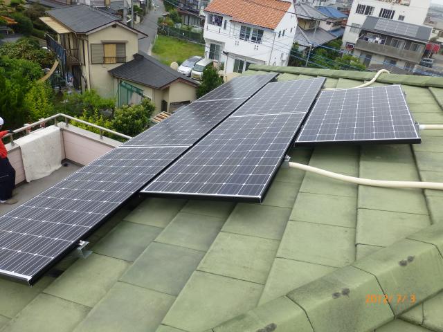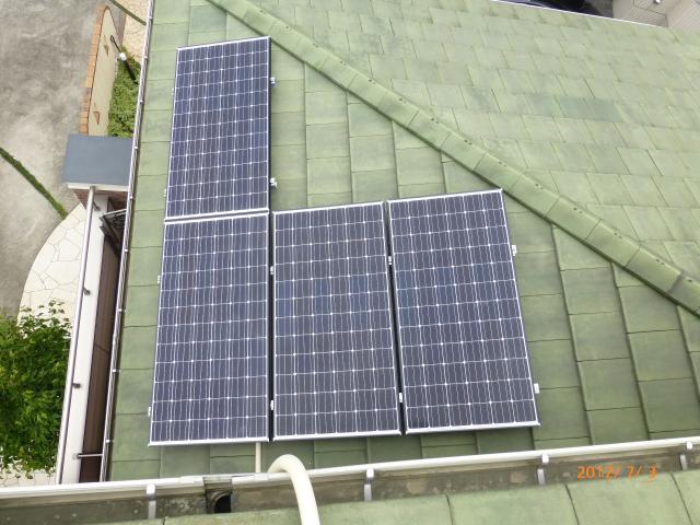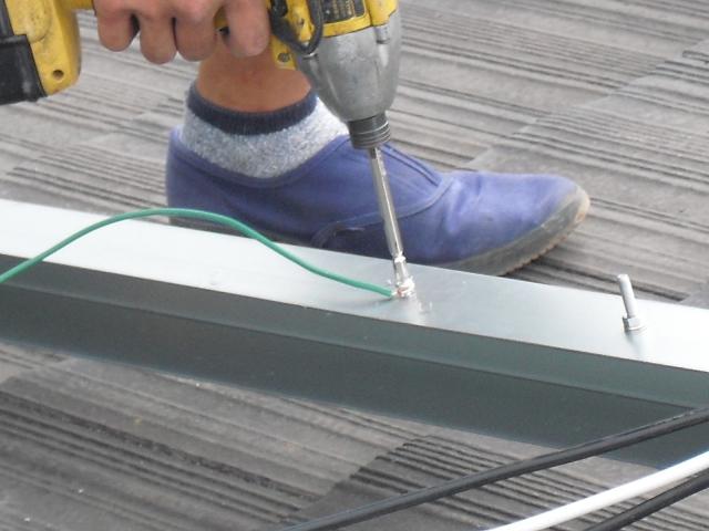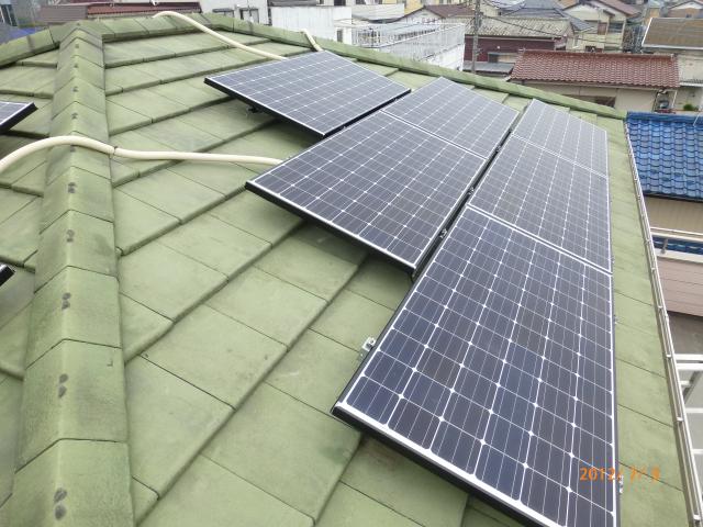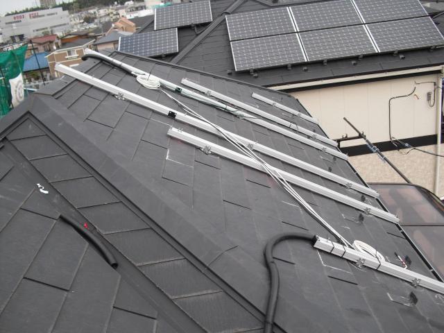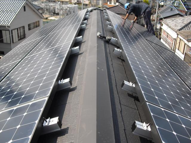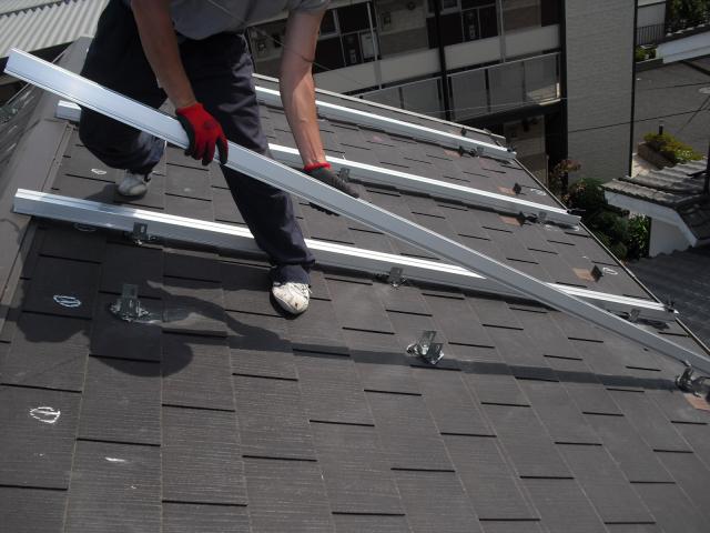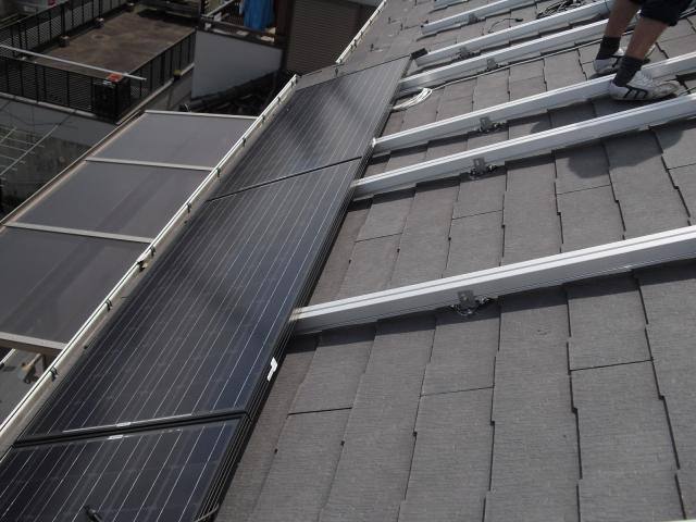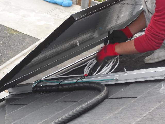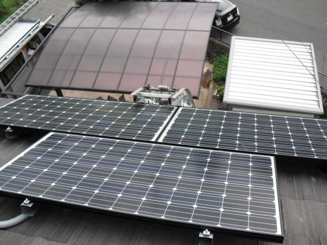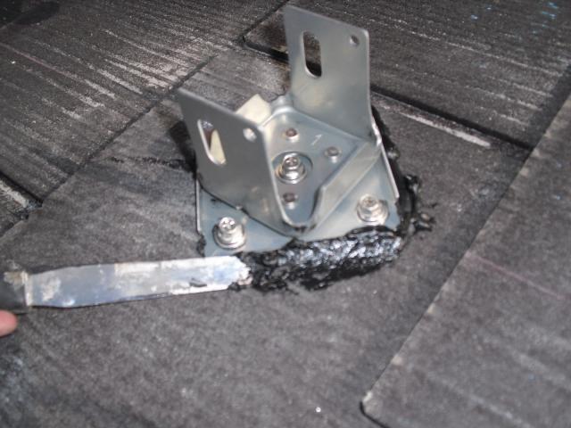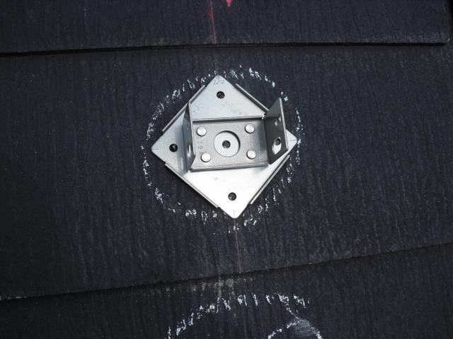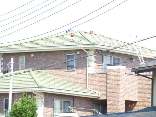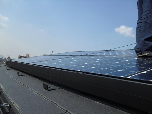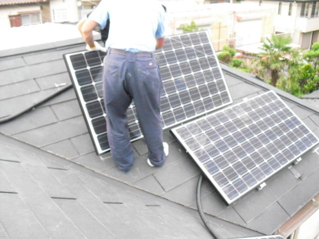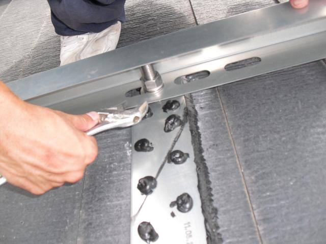 2012年7月3日 太陽光発電設置写真↑太陽光の架台を付ける為に、セメント瓦を一枚一枚剥がしアンカー金具を設置します。
