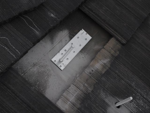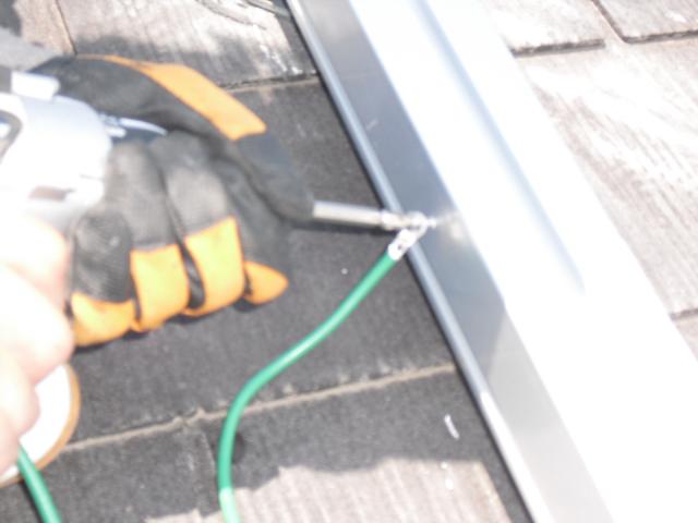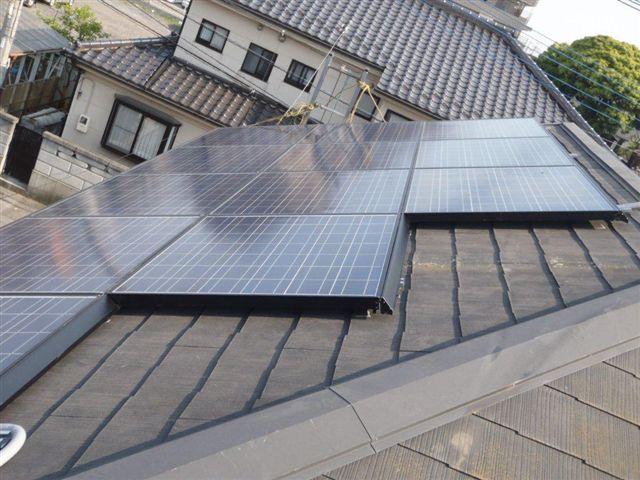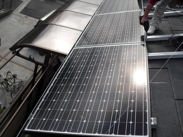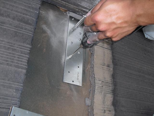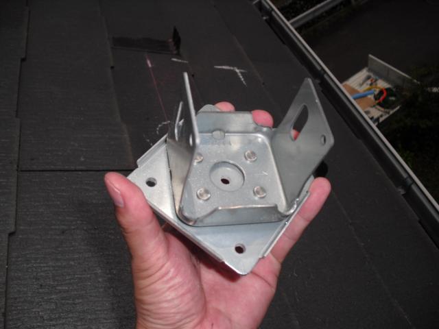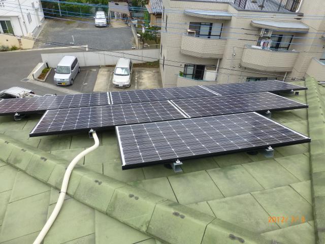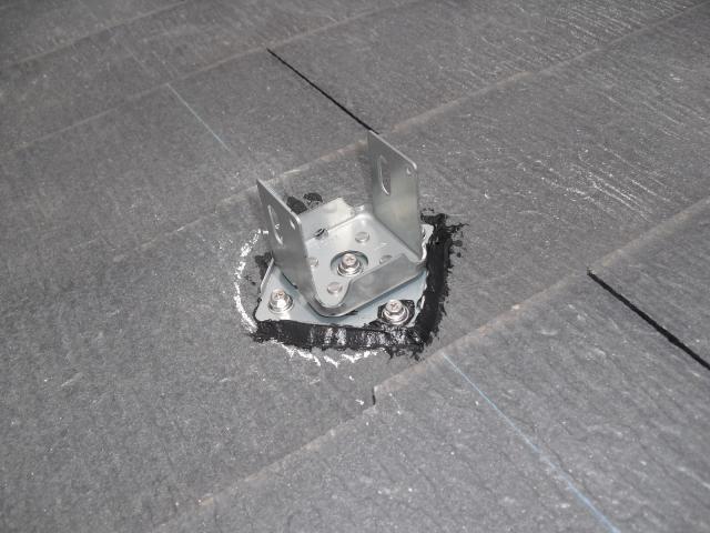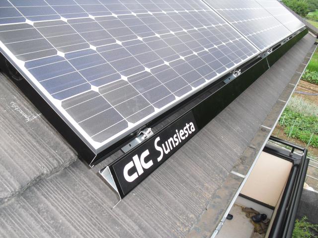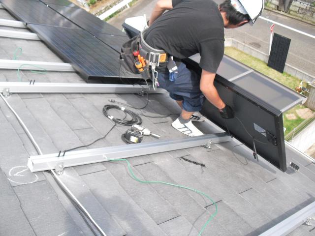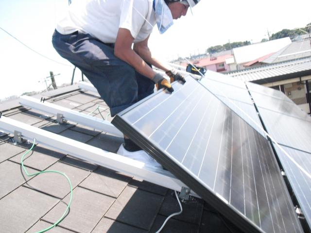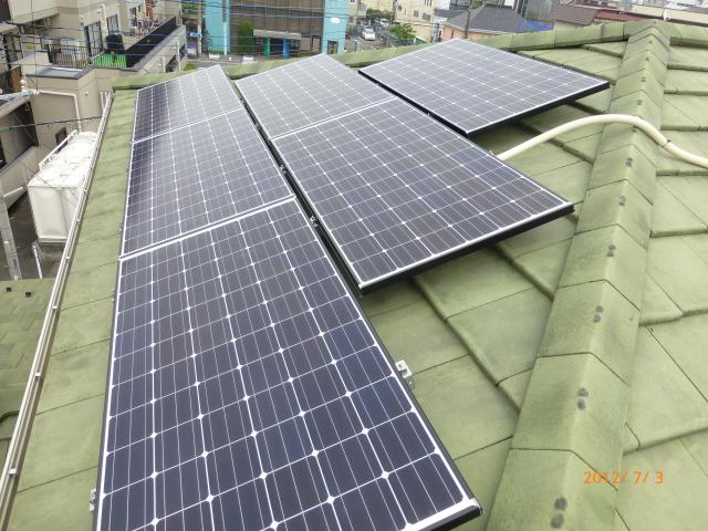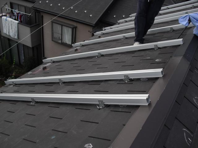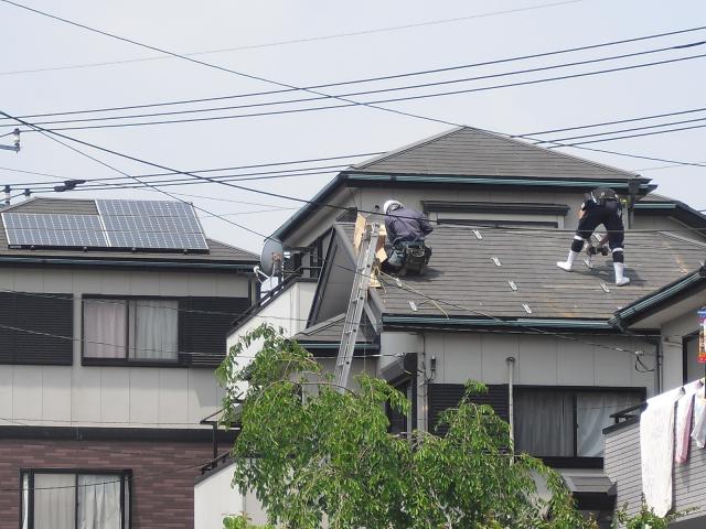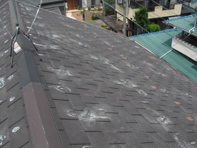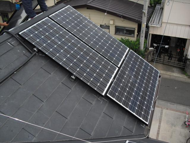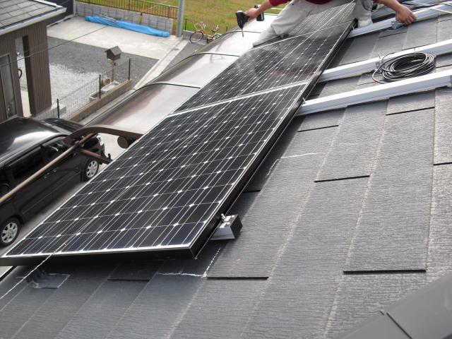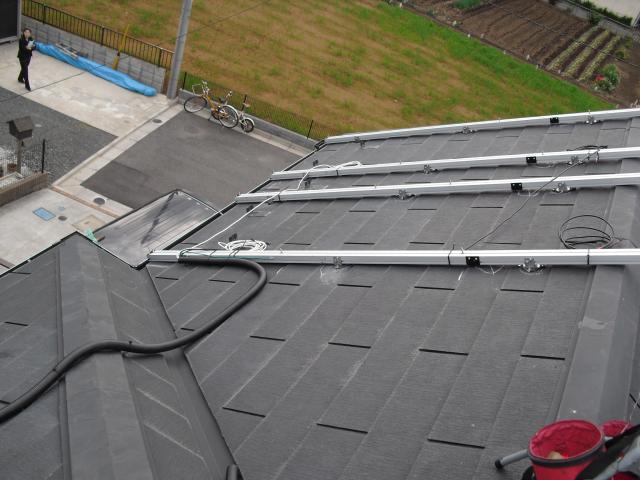 2012年7月3日 太陽光発電設置写真↑太陽光の架台を付ける為に、セメント瓦を一枚一枚剥がしアンカー金具を設置します。