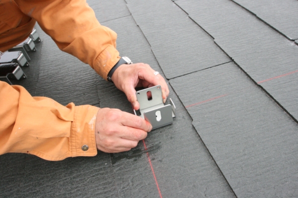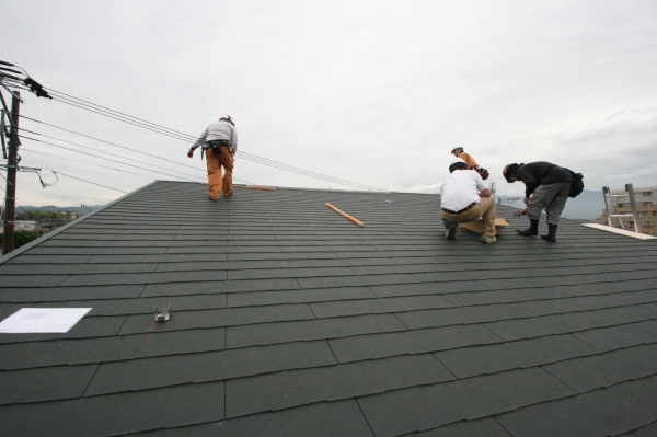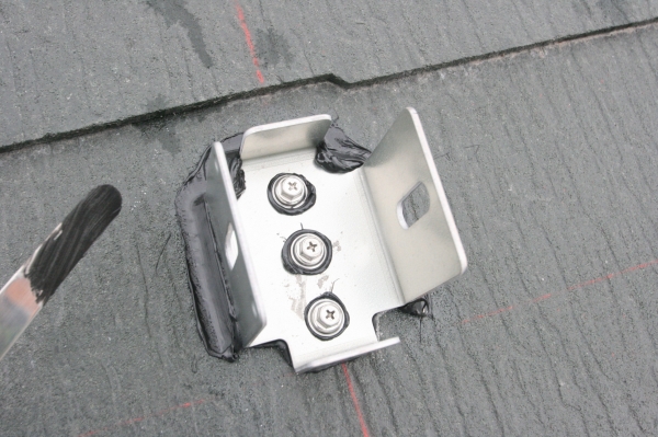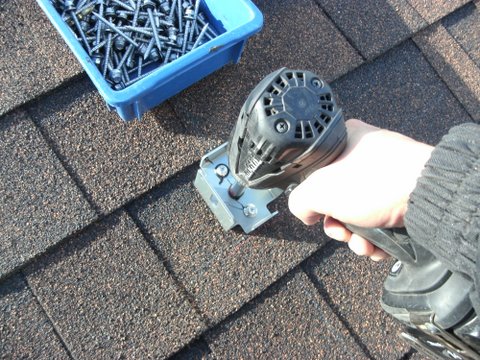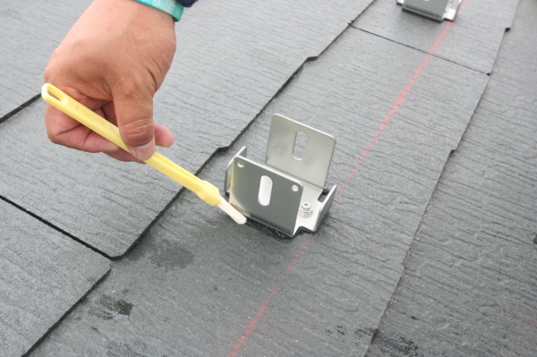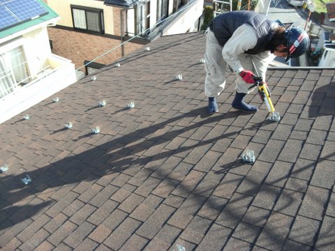 アスファルトシングルの屋根材へ金具を取付けしています。