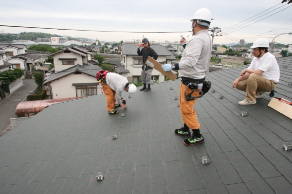 スレート屋根の塗装にあたっては、「縁切り」のためのスペーサーを挿入します。