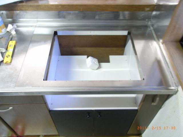 分かりにくいとおもいますが、ステンレス製のアダプターの取付けて、オーブンがあったところにキャビネットを据付けます。