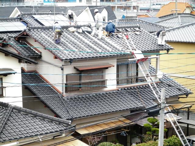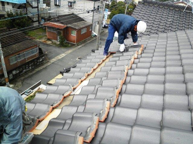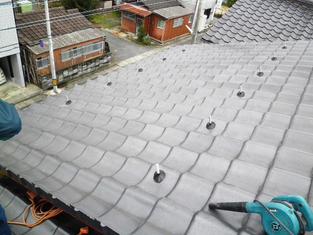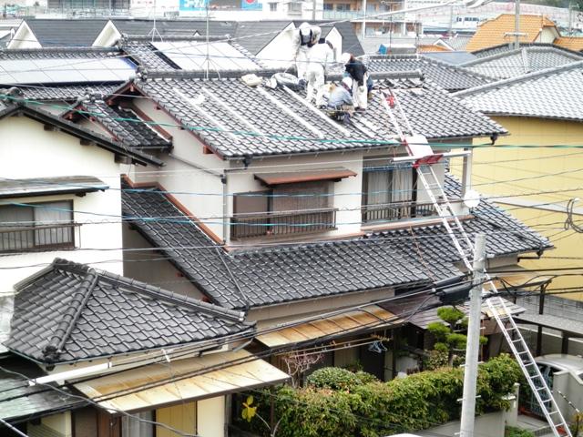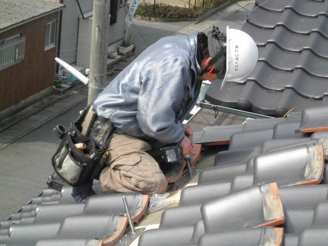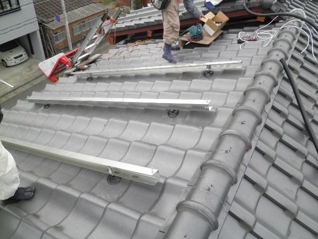 アンカーを取付けるための列の瓦を剥いでいます。