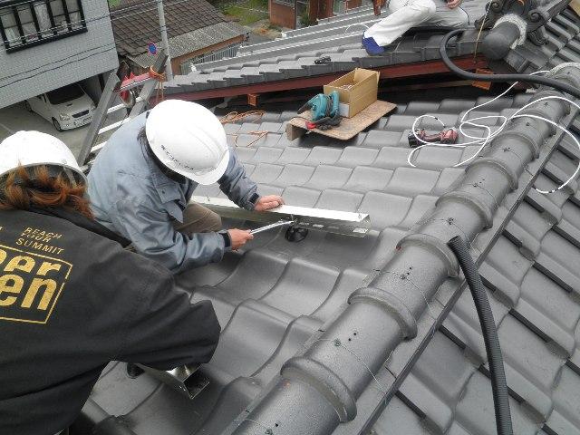切妻屋根の和瓦へのアンカー工法です。段違いの南側2面への設置になります。