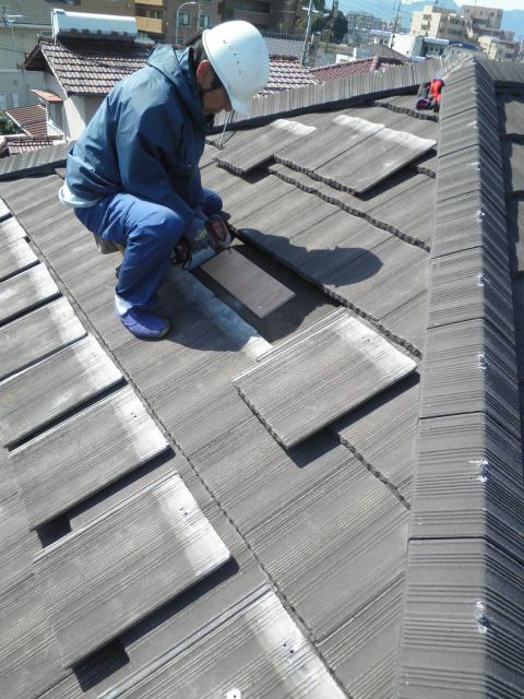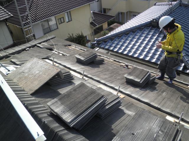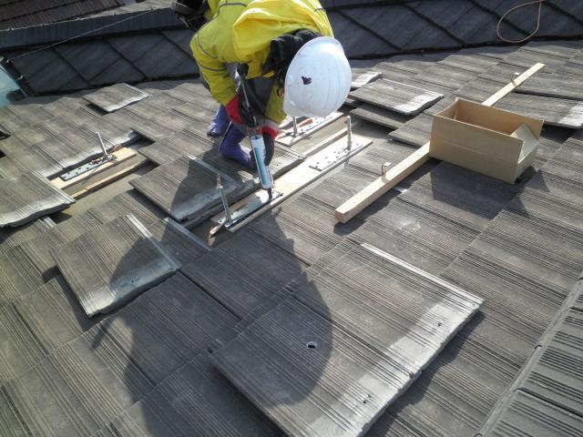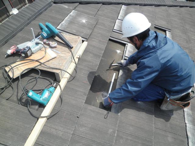 瓦を剥ぎ、アンカーと取り付けるための下地を探しています。