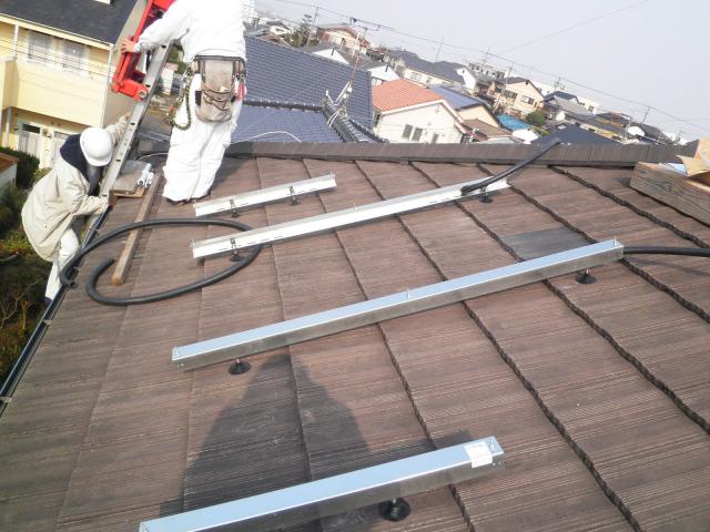 この工程までで、太陽電池モジュール(パネル)を取り付けるための下準備の完了です。屋根上の電気配線も済みました。