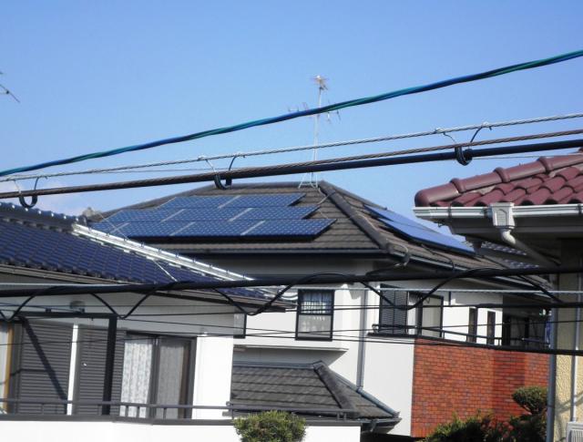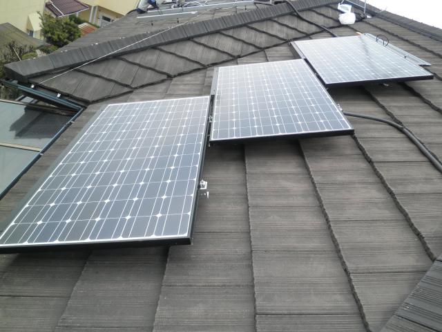 ですから、狭い屋根でも十分な容量が設計できる場合が多く、多結晶と比べて、単結晶は、曇りの日にも発電量が多いということ。さらに、アモルファスシリコン層を挟み込むという技術が、夏場の高温時にも発電量が低下しないというメリットがあります。デメリットとしては、やはり高額な太陽電池ということでしょうか。まぁ、製品のことはさておき、工事の様子を紹介しまーす。