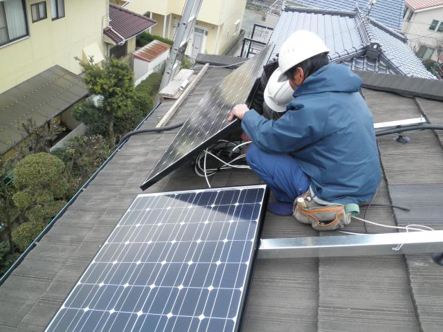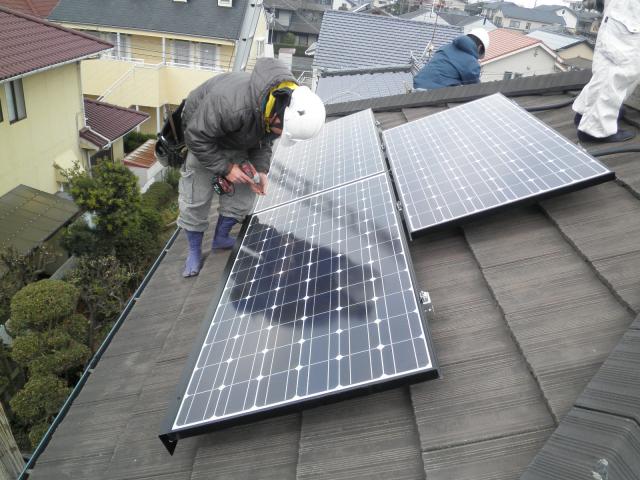 配線を繋げながら、太陽電池パネルを取付けします。