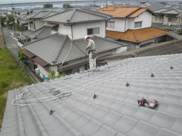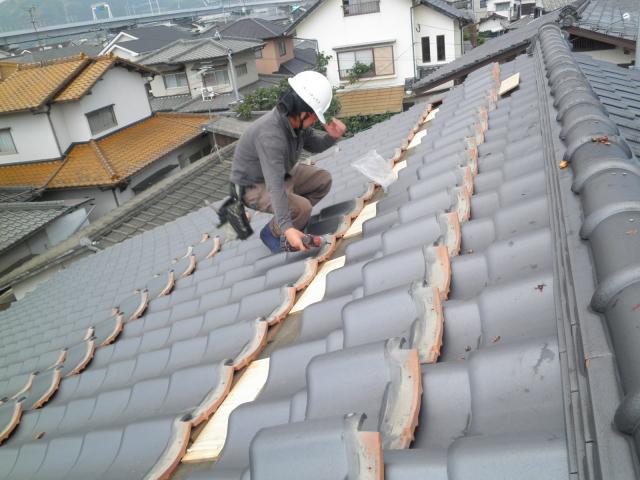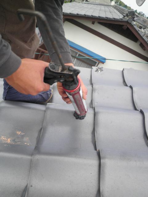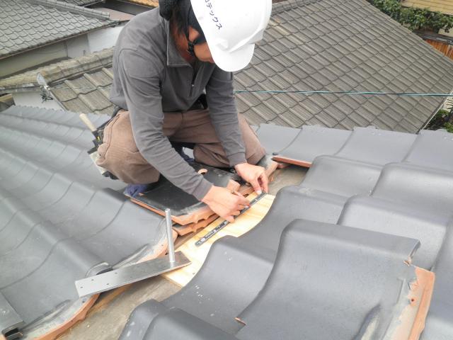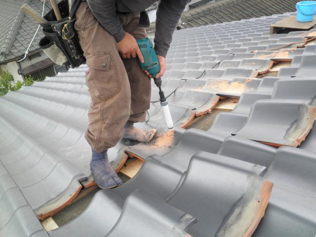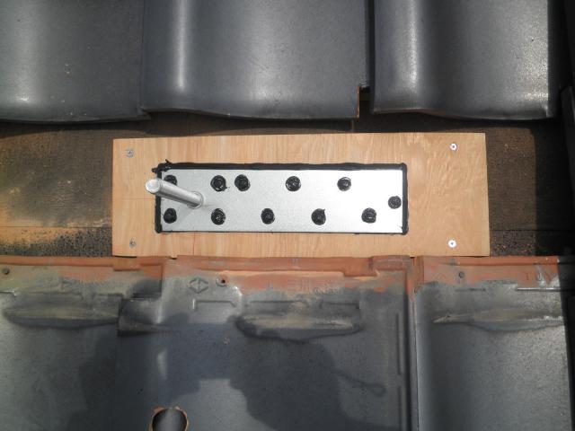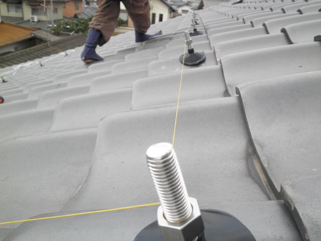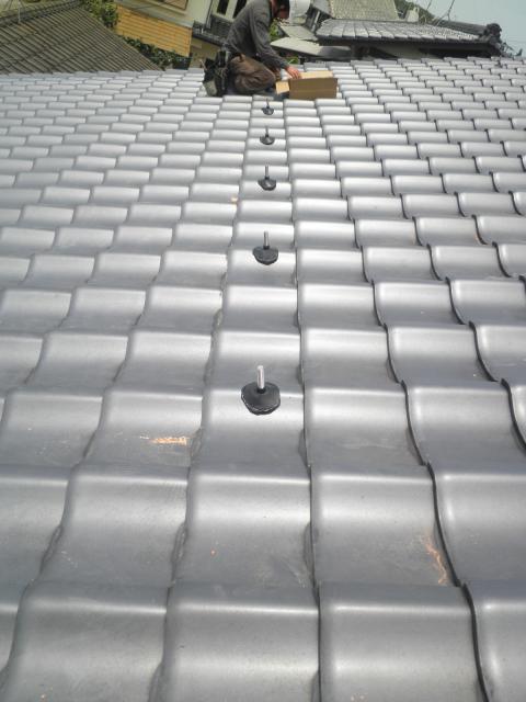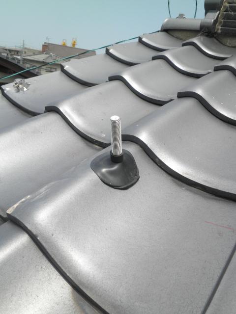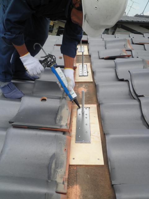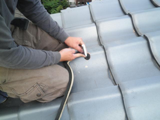 瓦の貫通穴とアンカーボルトの隙間にバックアップ材を詰めています。