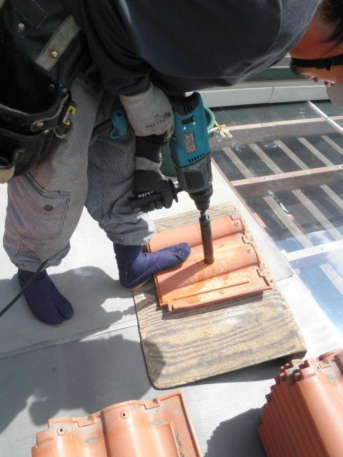 慎重に瓦に穴をあけていきます。(アンカーボルトを貫通するところに)