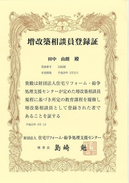 スタッフブログ 2011年10月7日先日、うちの田中が(財)住宅リフォーム・紛争処理支援センターの講習を受け、「増改築相談員」の登録ができました。