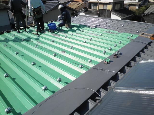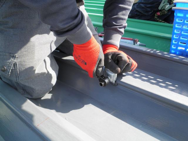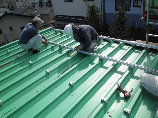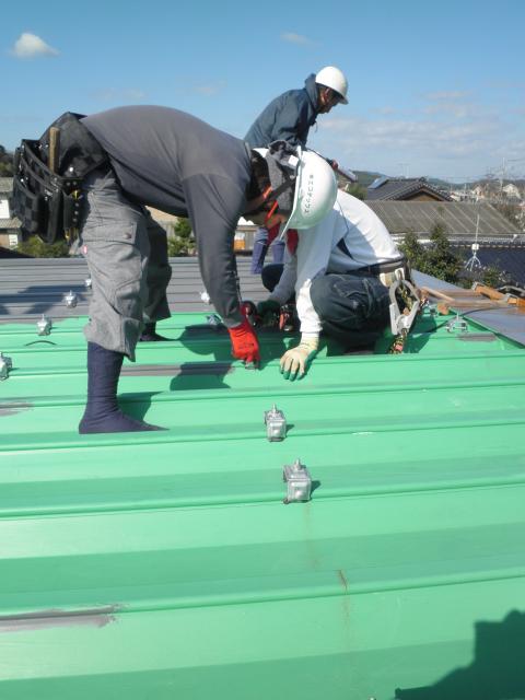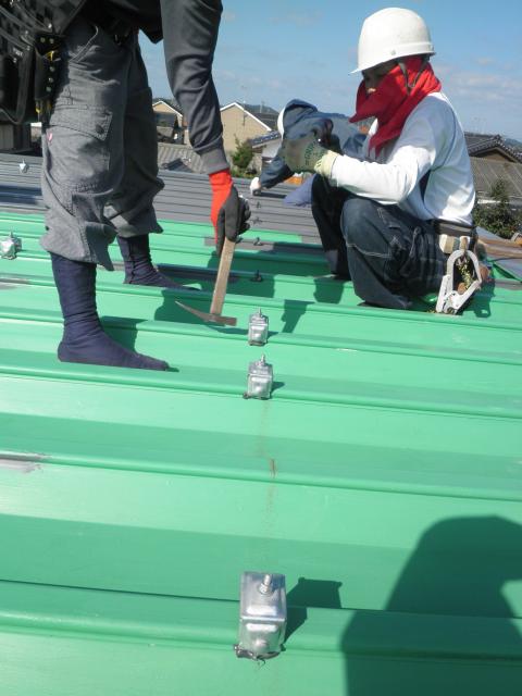まずは、墨出しを行い、折半屋根のハゼ頭へ「掴み金具」を取付けします。