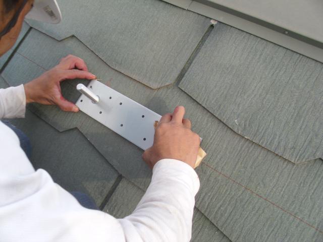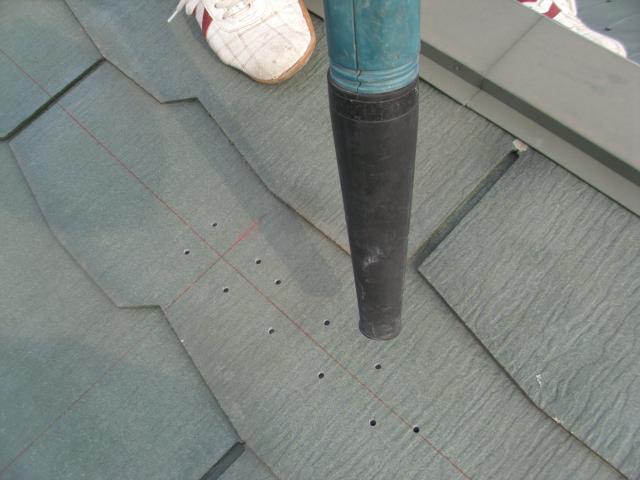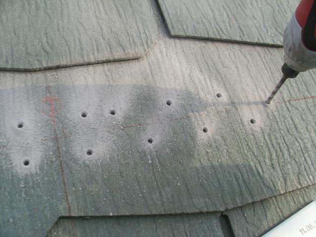 ↑ 墨出し後に、スレート瓦へ下穴を開けます。