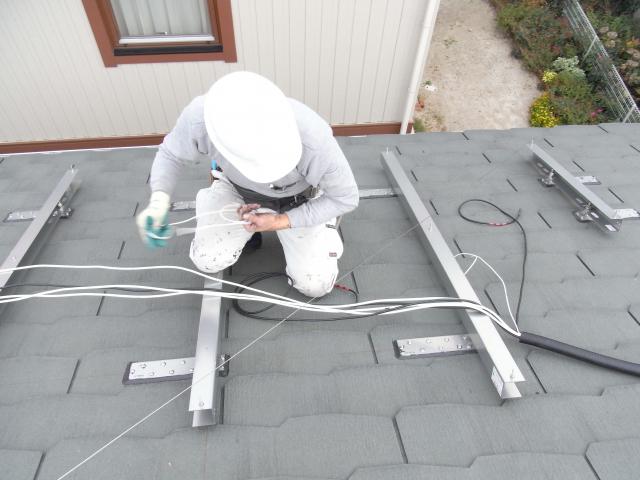↑ 架台の取付け後に、電気配線を施工していきます。