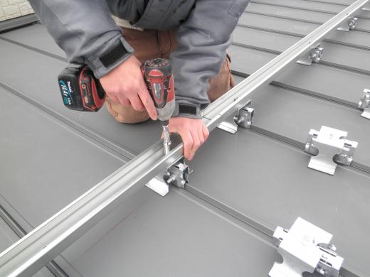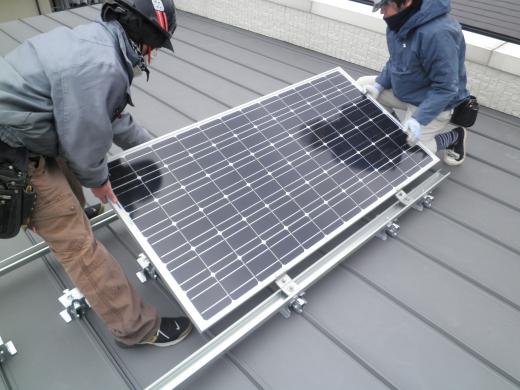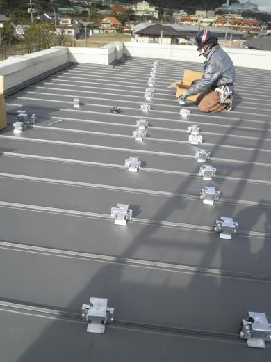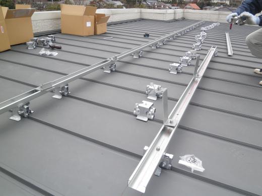 太陽光発電, 施工事例 2012年2月8日今回は、折半屋根へ「特殊支持金具」を使っての太陽光発電システムの設置を行いました。