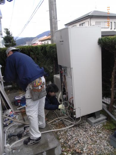 スタッフブログ 2012年2月12日地元早良区のお客様宅の屋根・外壁塗装と、浴室リフォーム工事にあたり、当社で2年ほど前に設置頂いたエコキュートの仮移設を行いました。