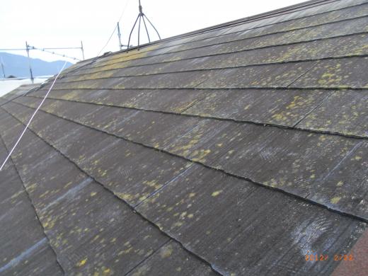 高圧洗浄することで、こんなに綺麗に。なんと、スレート屋根の素地まで見えています。
