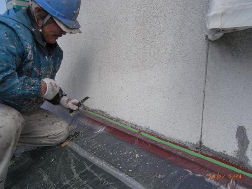 雨漏れの原因と思われる箇所のシーリングを打つため、古いシーリング剤を剥がしています。