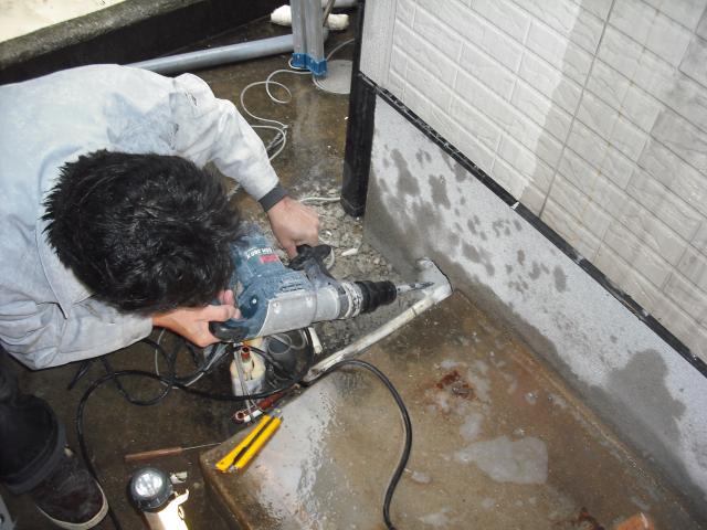 既存がセミオート(単管)をフルオート(往復管)へ変更するために、慎重に基礎を斫ります。