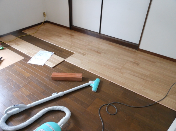 LDKの床フローリングの張替え(上張り)をしています