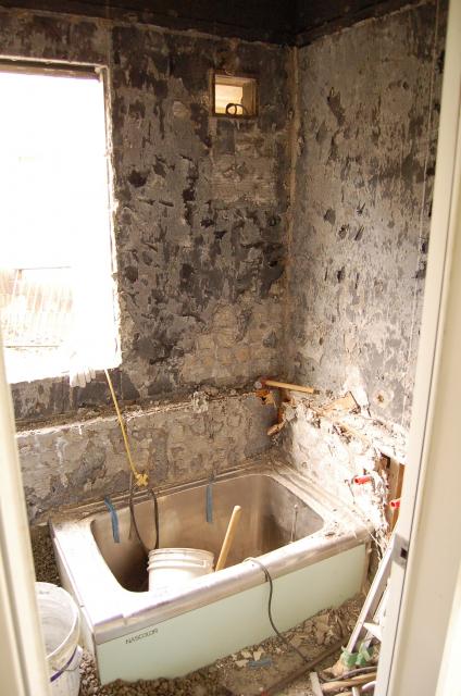 浴室を解体中。ほこりなどが洗面所にいかないように、とにかく、養生・養生・養生です。