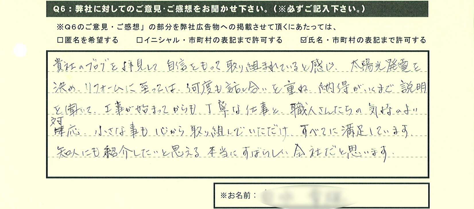 そして、弊社が工事後におこなっているアンケートをご返信いただきました。