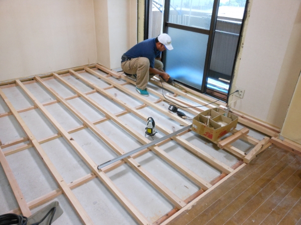 既存の床と同レベルまで床の下地を施工中