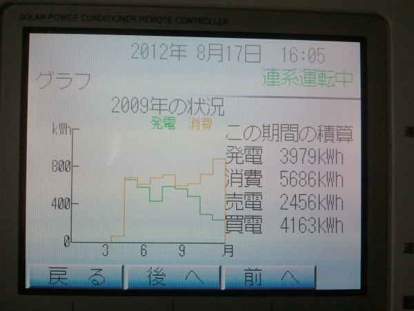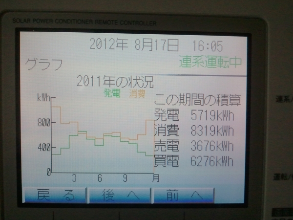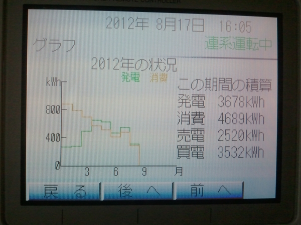 2012年は継続中ですが8/17現在で3,678kwhの発電。売電は2,520kwh×@48円で120,960円!