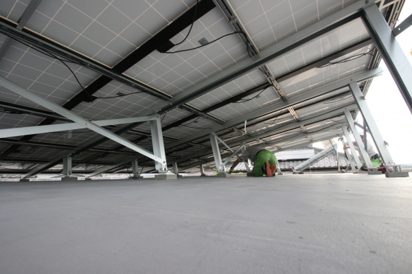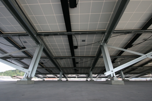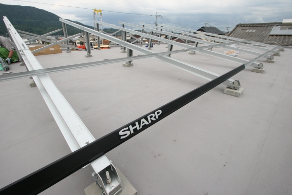 陸屋根架台の設置が完了。太陽電池モジュール(パネル)の設置は後日に行ないます。