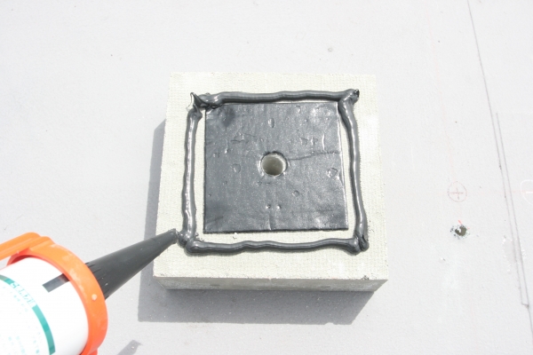 ブチルテープの剥離紙を剥がし、後で流し込む接着剤が流れ出ない様に変性シリコンを打ちます。
