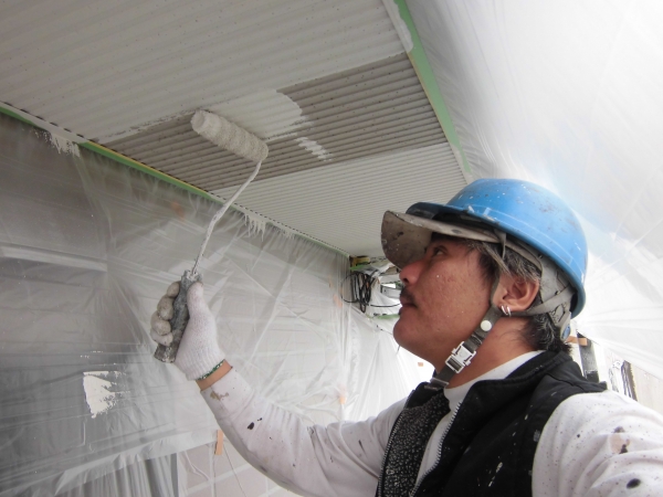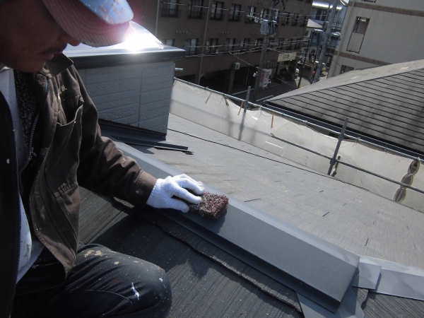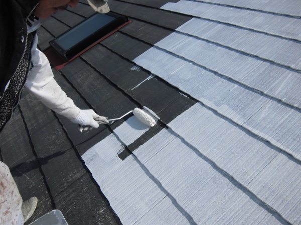 この工程を省くと、スレート瓦との隙間に塗料が流れ込み、隙間を封止してしまい、万が一雨水が侵入した際に、水が抜けなくなります。とても大切な施工方法です。