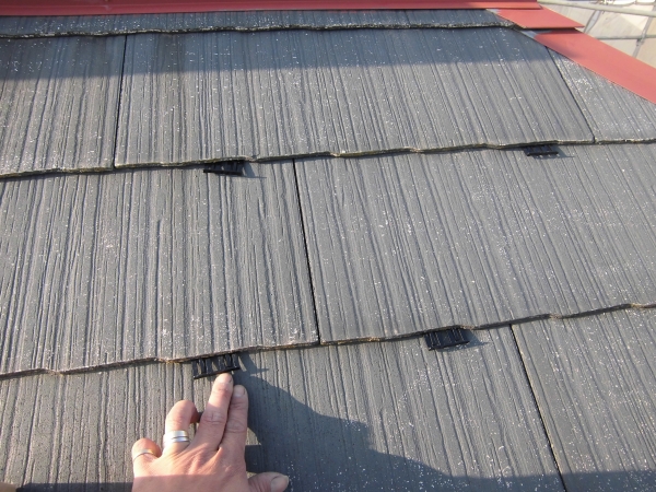 スレート屋根の塗装にあたっては、「縁切り」のためのスペーサーを挿入します。
