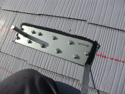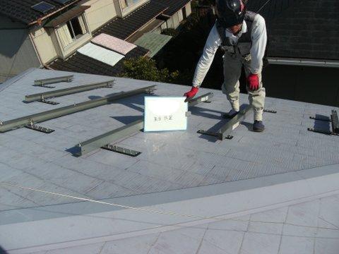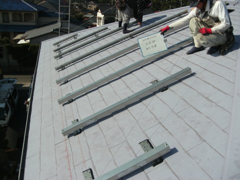アンカー工法にてスレート瓦へ架台を取付けていきます。