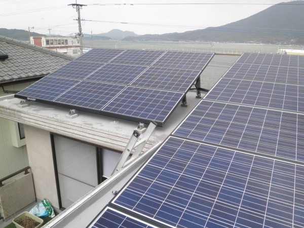 既存の太陽熱温水器を降ろして、移設し、既設太陽光発電システムへ同じ太陽電池パネルを9枚増設して、8.55KWのシステムへの増設工事を行ないました。