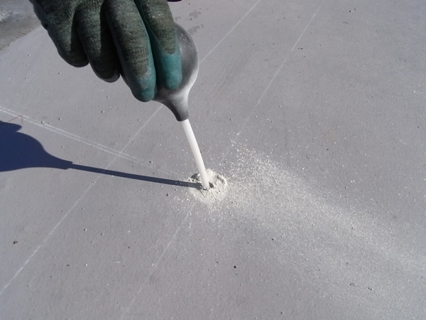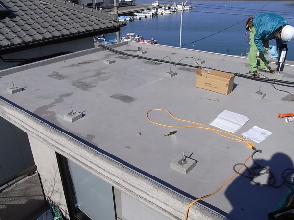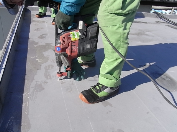 シート防水の屋根へアンカー穴を開けます。