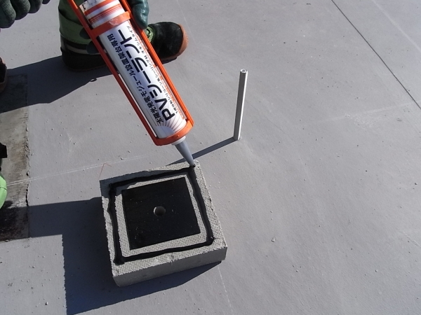 太陽光専用の変性シリコンで架台ブロックにコーキングします。