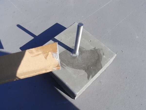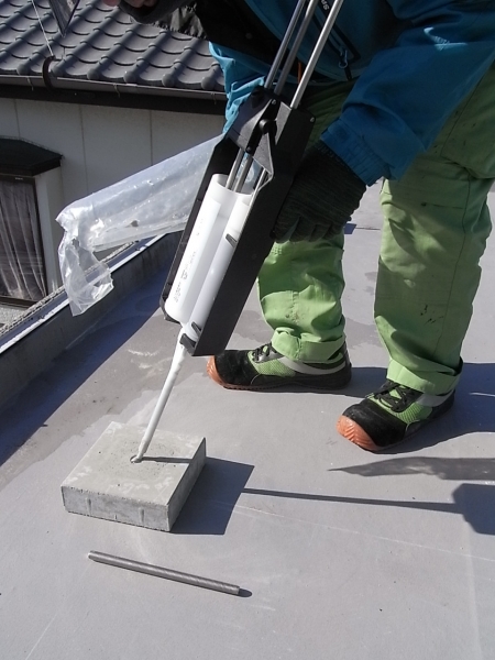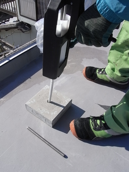 架台ブロックを設置、アンカー穴へ専用の二液式エポキシ接着剤を充填します。