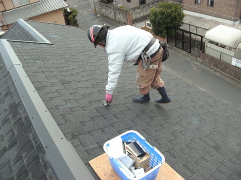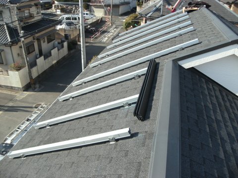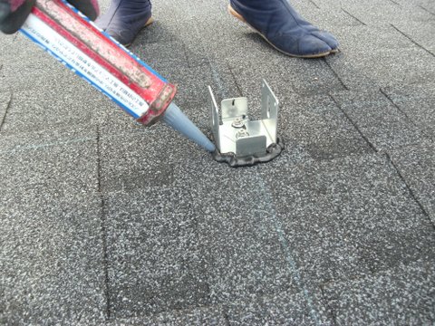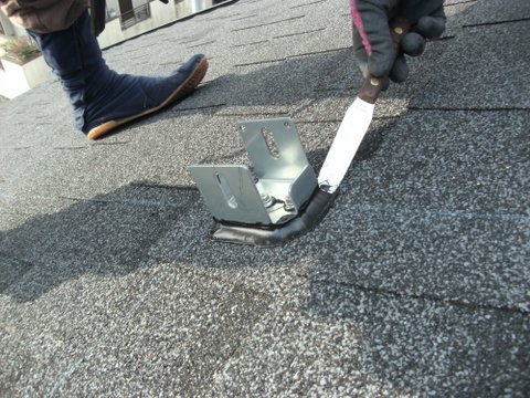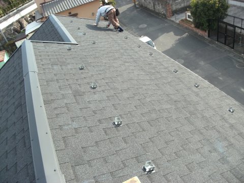 アスファルトシングル葺きの屋根へ架台取付の金具を設置していきます。