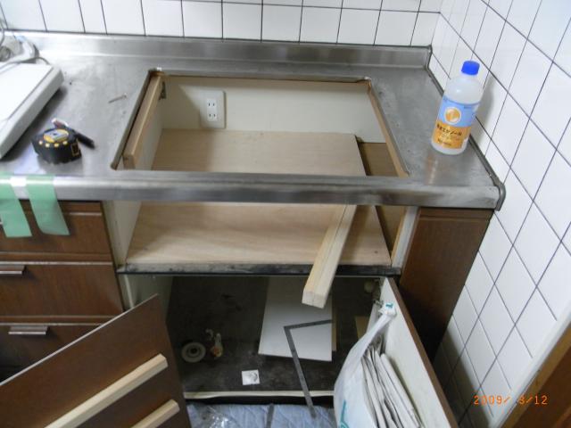 ↑ まずは、既存のガスコンロを撤去・キャビネットの強度を確保するために、天板に合板を貼ります。