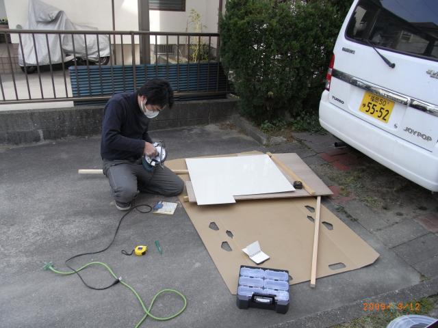 ↑ 次に、キッチンの開口部をふさぐために、キッチンパネル材の裏に補強桟を取り付け、両面テープを付けます。