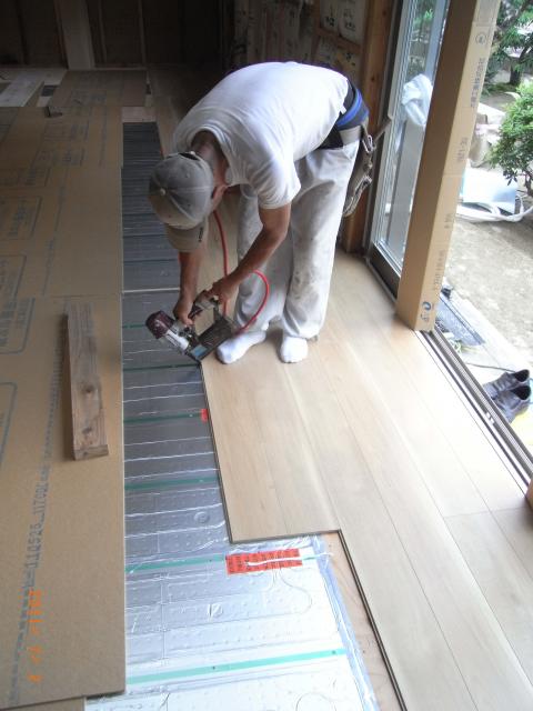 フローリングがどんどん張られていきます。毎日暑いけど、頑張れ清水大工!
